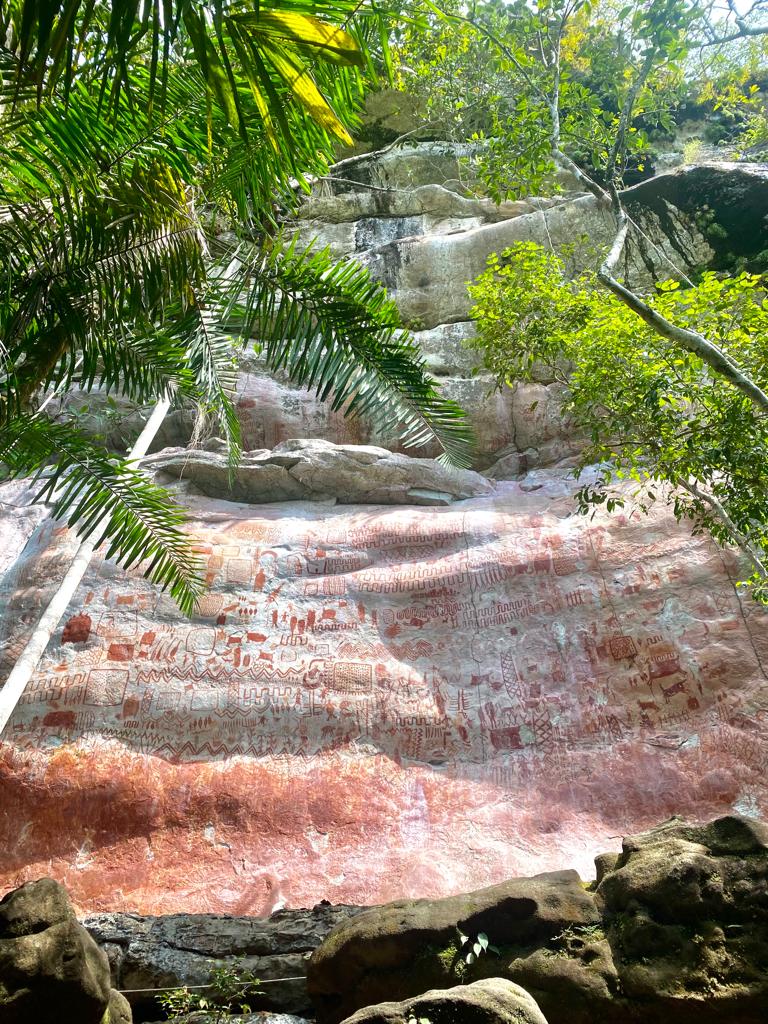 Conocido como la "Puerta de Chiribiquete" por su afinidad geológica y cultural con el Parque Nacional Natural Serranía de Chiribiquete, Cerro Azul es una ventana abierta al pasado. A lo largo de sus 1,200 metros cuadrados de arte rupestre, sus pictogramas cuentan historias de la vida, la naturaleza y la espiritualidad de las antiguas civilizaciones amazónicas. Este legado arqueológico fue reconocido oficialmente en 2018 como patrimonio por el Instituto Colombiano de Antropología e Historia (ICANH), y es un sitio único para quienes desean profundizar en la historia precolombina de Colombia.